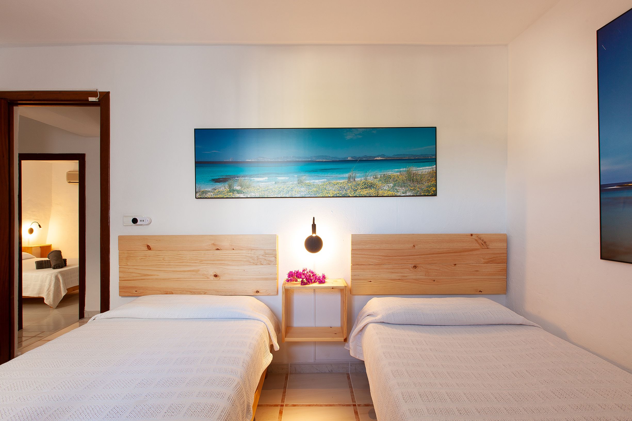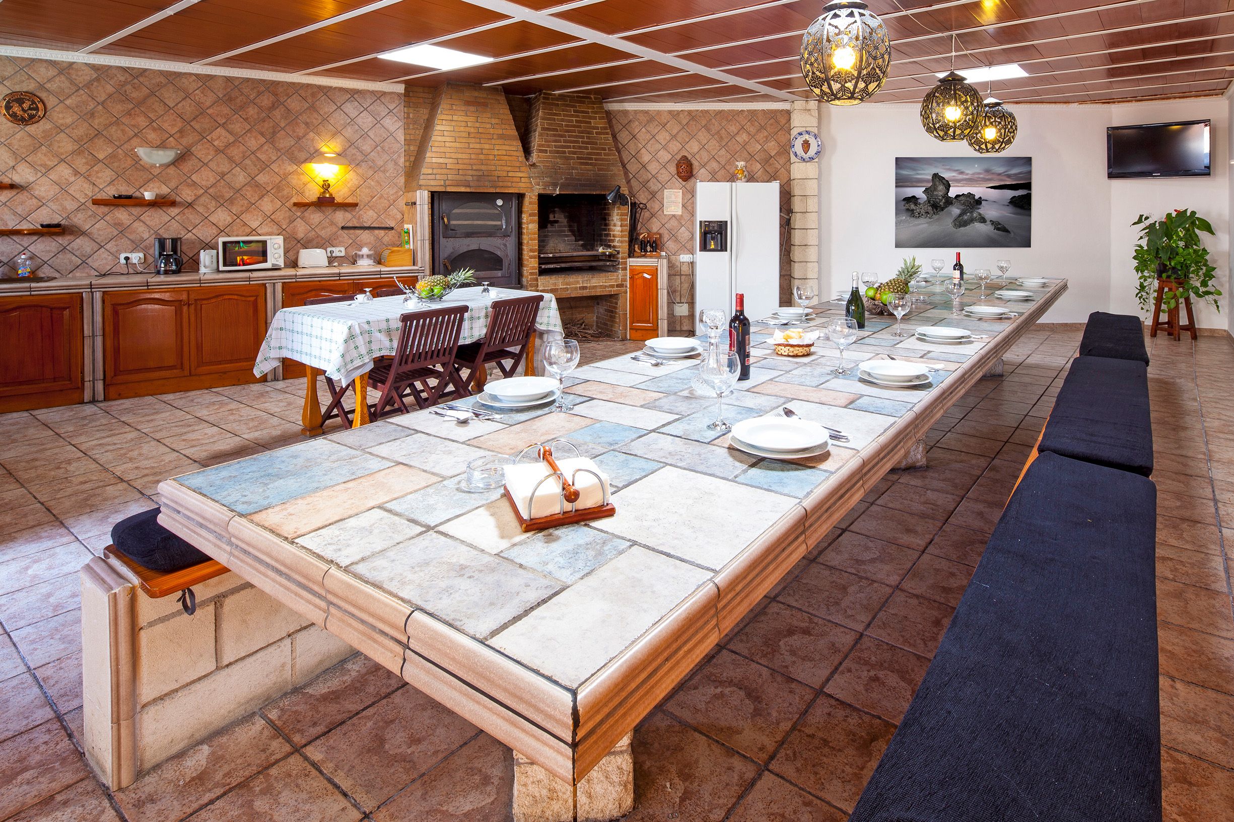 Estupenda Villa ubicada a 1 km de San Rafael, un entorno apacible y natural, un ambiente muy acogedor que invita al relax, muy bien comunicada, a 10 minutos de Ibiza, San Antonio y muchas playas. 6 habitaciones dobles, 4 cuartos de baño completos, salón TV, una habitación espectacular de 75m2 con baño completo, recibidor con sofás, mini bar. Cocina independiente de la casa de 75 m2 y mesa de obra para mas de 18 personas, con horno de leña, barbacoa, vitrocerámica, horno, y todo el equipamiento necesario para su estancia si desean cocinar, donde hacer vida, comer, cenar...sin molestar al resto de personas que estén descansando en la casa. Todo el recinto vallado. Amplias terrazas ajardinadas, barbacoa, piscina y parking para 6 coches.
